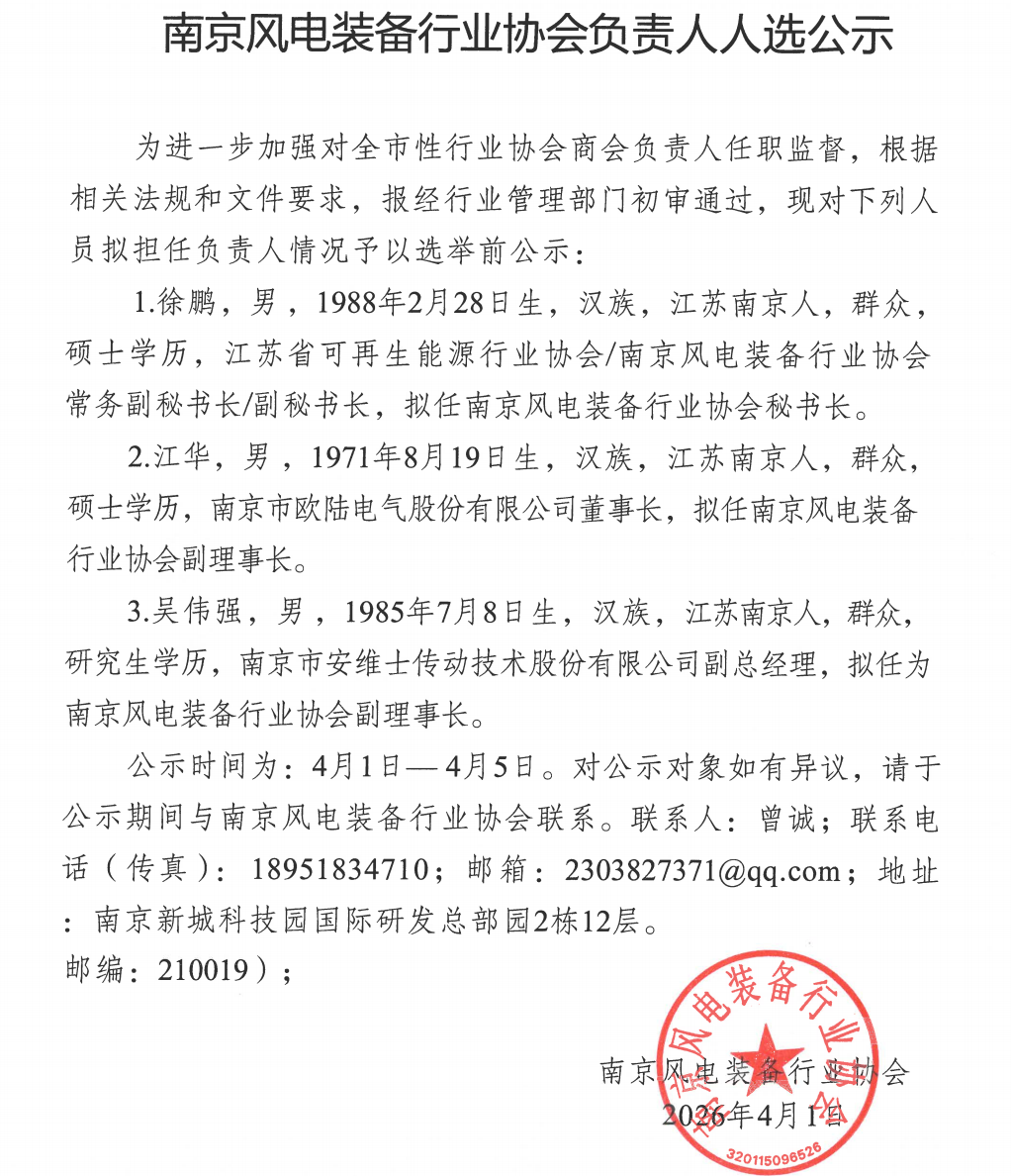 南京风电装备行业协会秘书长及负责人选举前公示
